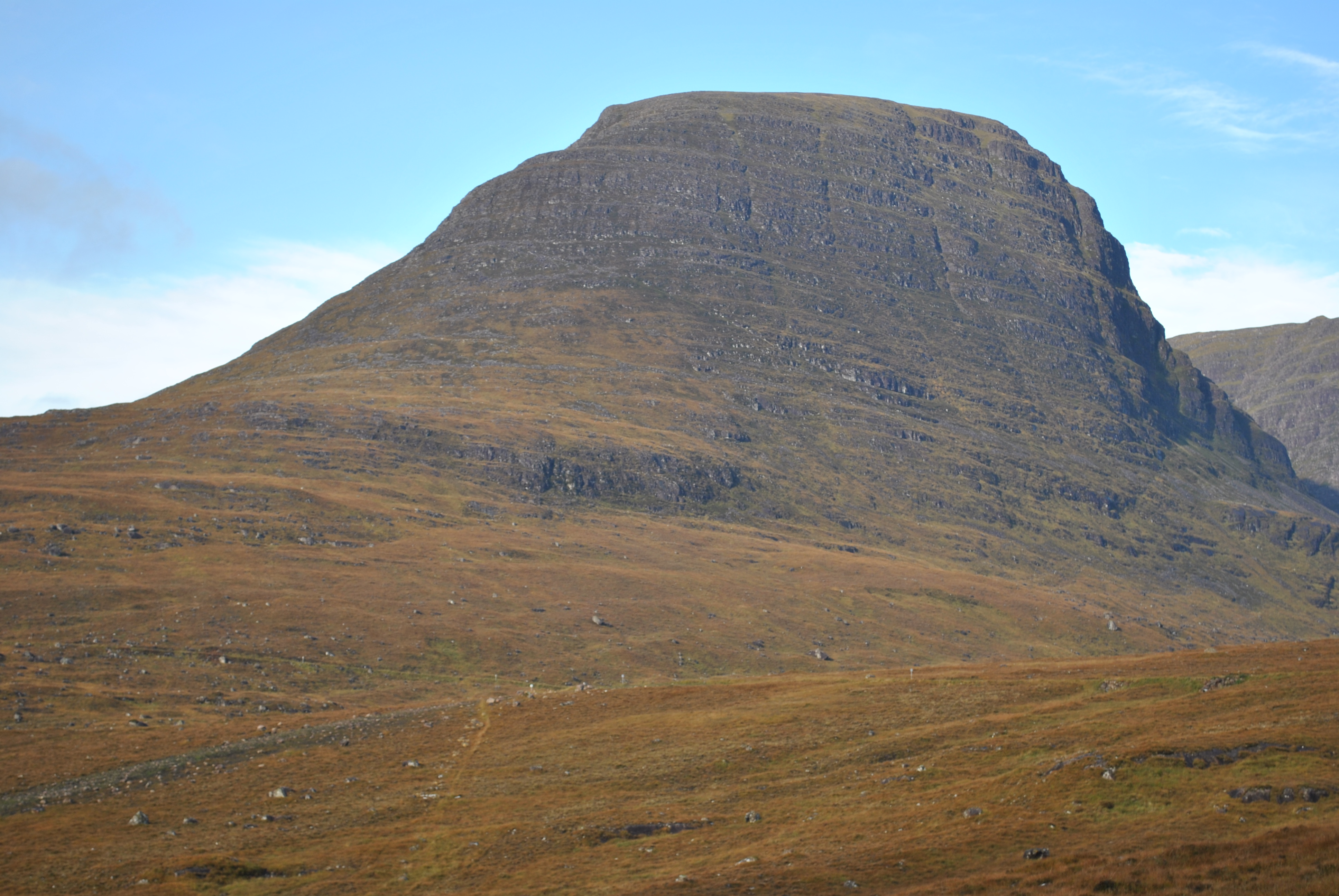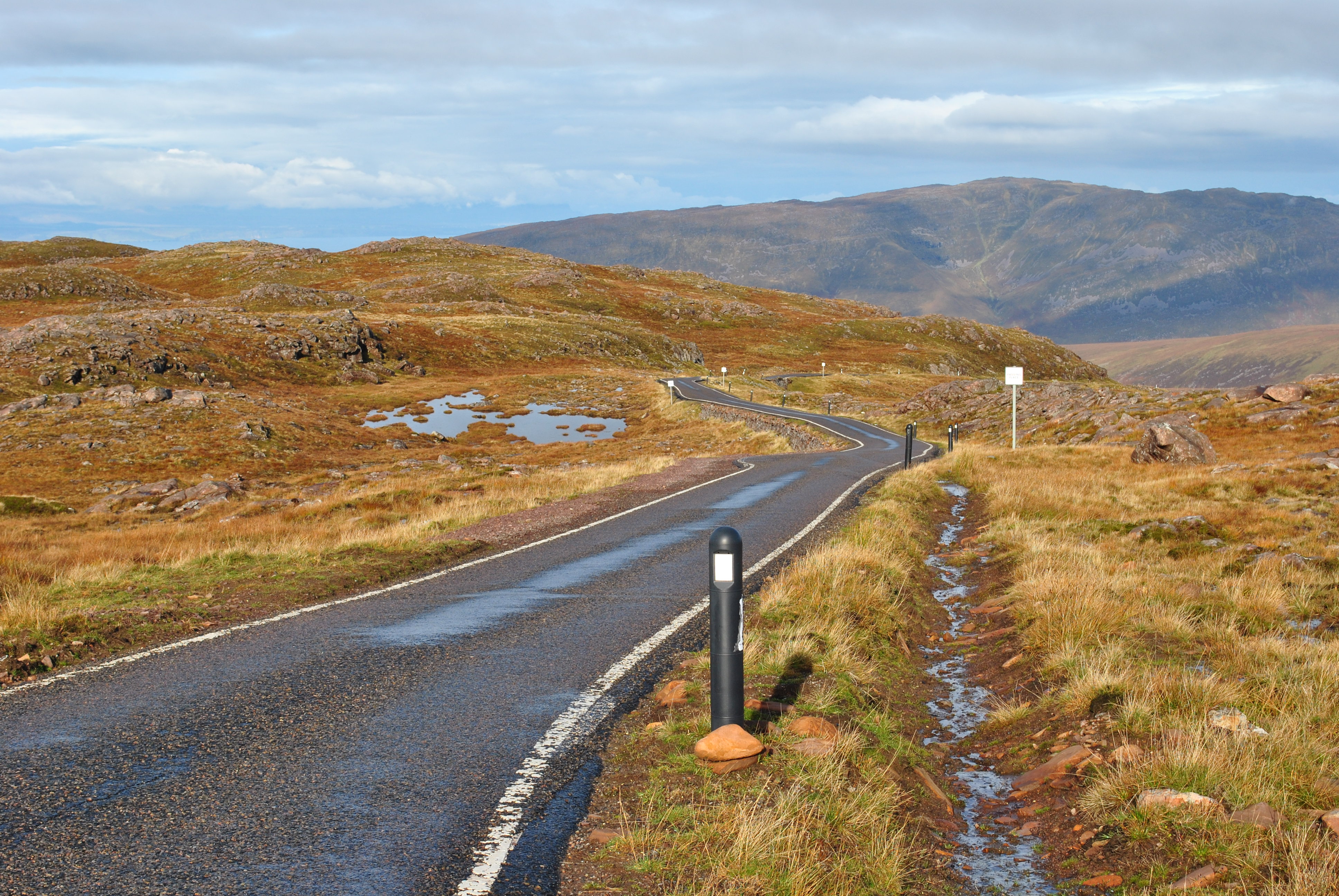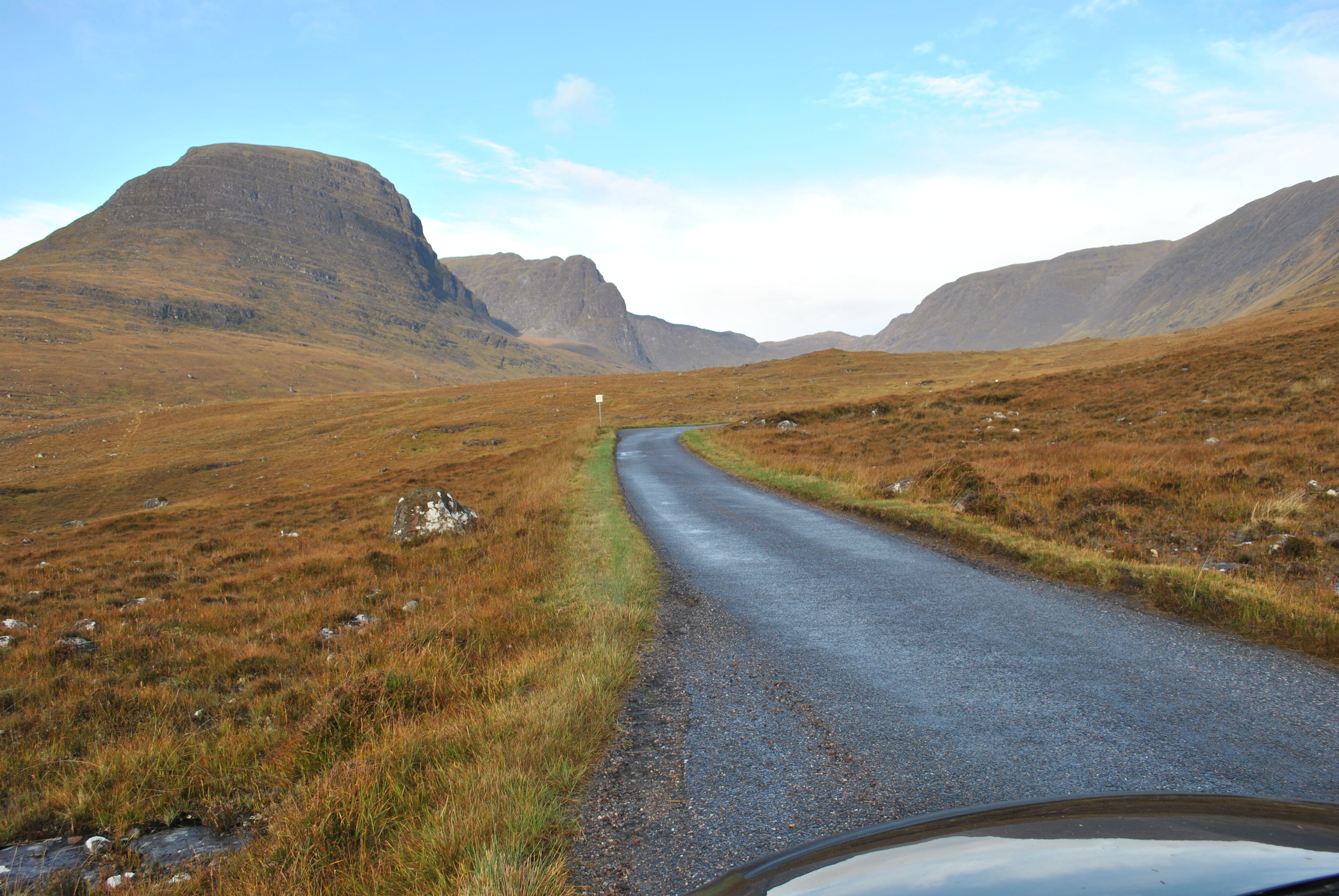 Sicher oben angekommen, hat es nur noch 4,5 Grad und das Auto blinkt Glättewarnungen. Doch die Straßen sind ok. Was für eine atemberaubende Gegend, weit und breit nur Einsamkeit und Steinwüste. Die schlichte aber überwältigende Größe der Torridon Berge. Weit und breit nichts, kein Baum und kein Strauch.