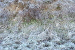Die Algen haben sich schon wieder über der Falle zugezogen. Ein tiefer, Wasser führender, überwachsener Graben. Zugefroren. Eigentlich nicht zu erkennen.