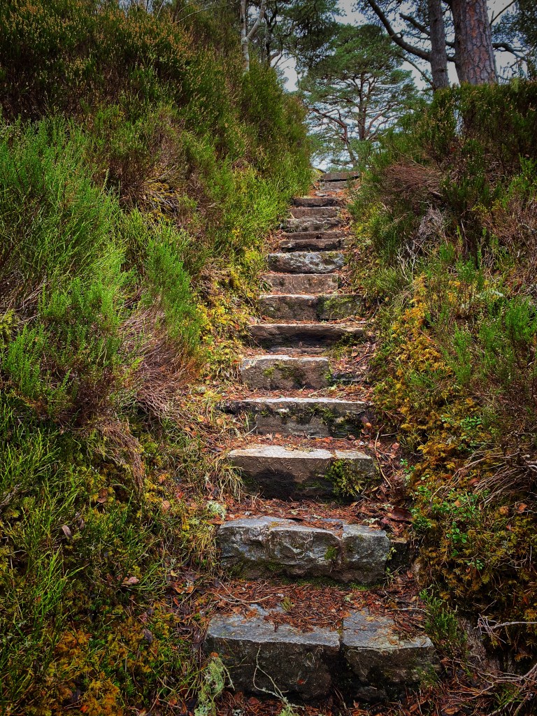 Bald komme ich zu einem einsamen kleinen Wildsee namens Coire Loch, sehr schön gelegen und offensichtlich ein Paradies für Insekten. So erklärt mir das eine der vielen Tafeln, die hier hinter jedem zweiten Baum stehen hinter jedem dritten Stelen für die Kinder-Bespassung, hölzerne Otter zum aufklappen und so. Ich bin froh, dass ich jahreszeitenbedingt das Insektenparadies verpasse und versuche all die anderen Bemühungen, mich zu informieren und zu erziehen zu ignorieren, weil ich ja in der ursprünglichen Wildnis des kaledonischen Pinienwalds unterwegs bin und ich das wahre, alte Schottland erfahren möchte. Im Moment hat es mehr dem Charme von Waldlehrpfad beim Schulausflug. An steilen Stellen hat man hier sogar Steintreppen angelegt. Wie im Kurpark!
