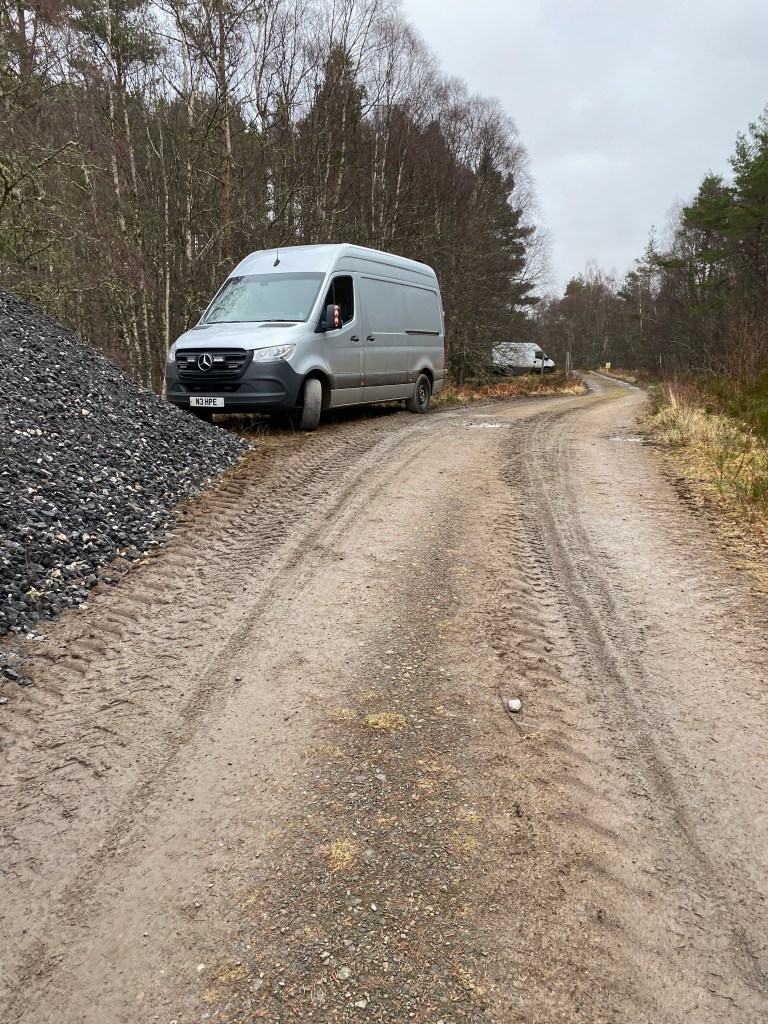 Plötzlich mehr Schilder. Vorsicht, Waldarbeiten! Das kenne ich nun aus dem Schwarzwald zur Genüge. Doch dort handelt es sich in der Regel um Baumfällarbeiten. Hier stoße ich zunächst auf einen Haufen geparkte Transporter, und dann auf eine Gruppe junger Männer, die mit Baggern, Rüttlern und Teermaschinen die wilde Natur von Glen Affric zähmen. Sie tragen Leuchtwesten und Ohrschutz und schreien sich Kommandos entgegen. Sie sind ja auf einer Baustelle. Ich glaub, mich knutscht mein Elch!