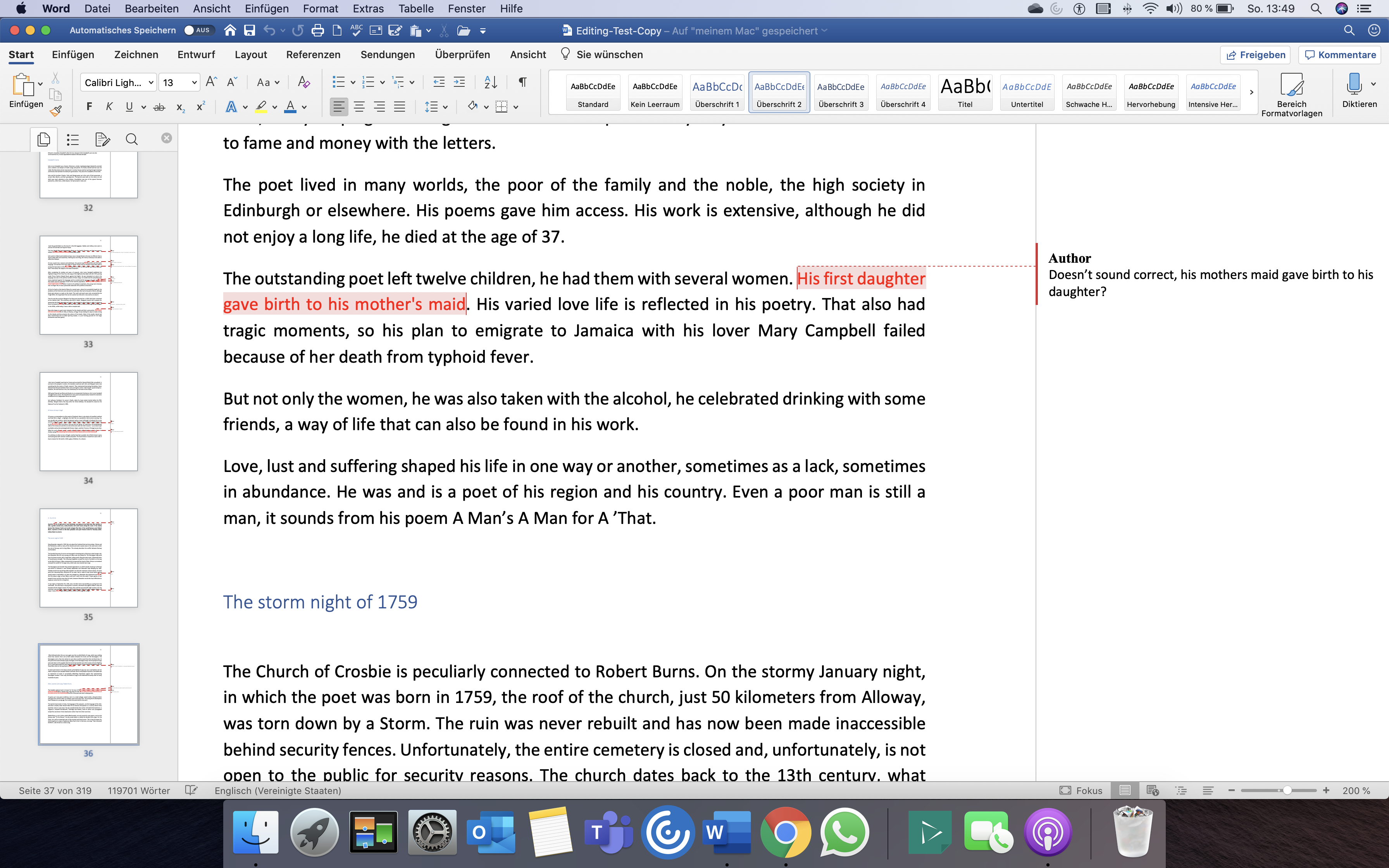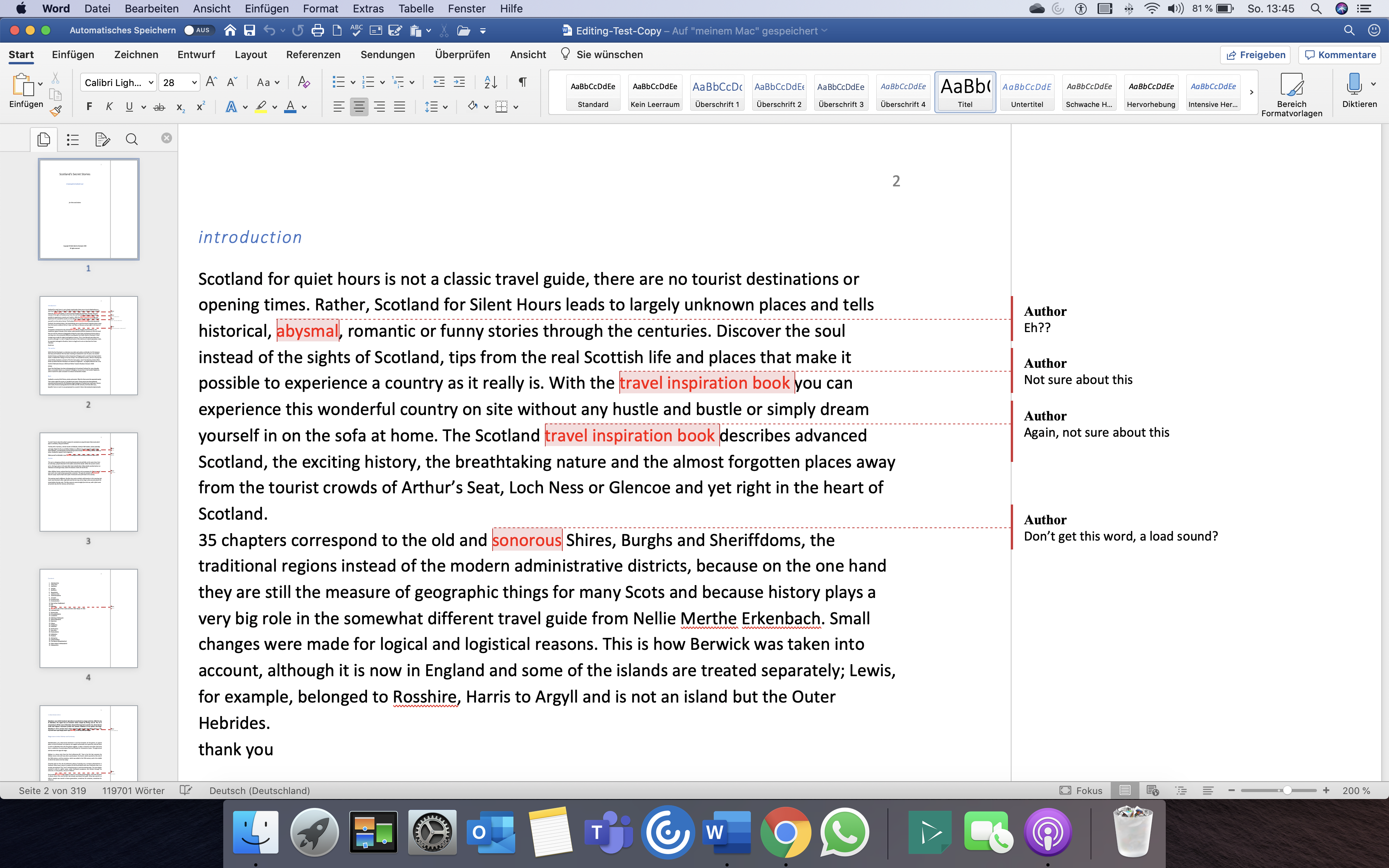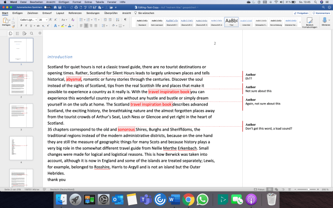 Noch immer im Lockdown und mit wenig Arbeit, um sich abzulenken, legt der Mann in den Highlands los und schickt mir noch am selben Abend das erste Kapitel korrigiert zurück.