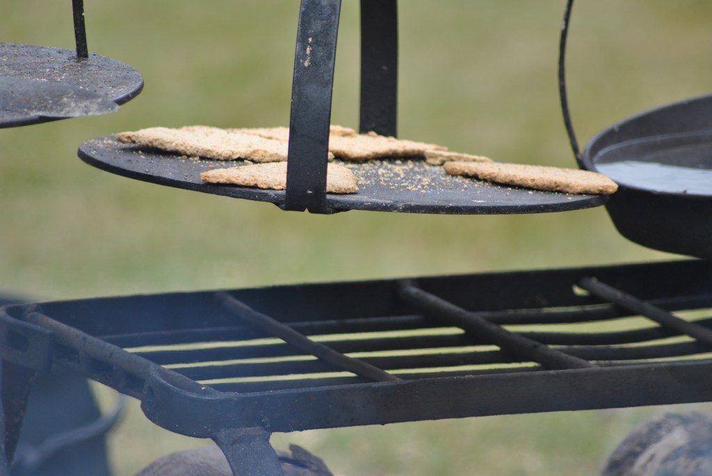 Mittelalterliche Ritter pflegten Schwerter und Schilde. Die Frauen bereiteten die traditionellen Bannocks auf offenem Feuer zu.