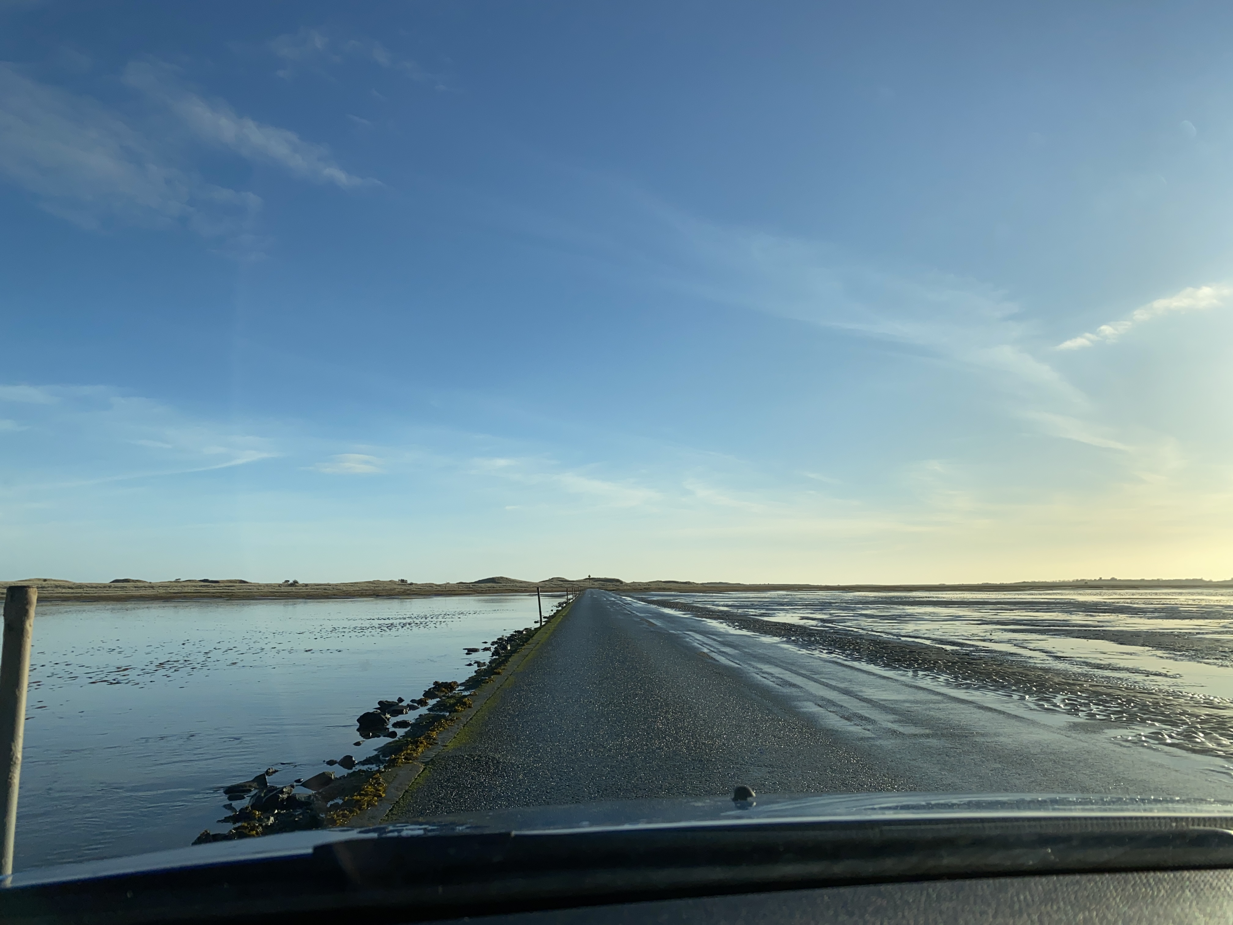 Dementsprechend angespannt beginnen wir unsere Reise und stehen früh morgens um 8:15 Uhr tatsächlich am Causeway, der die Insel mit dem Festland verbindet. Noch liegt ein bisschen Wasser auf der Straße – nur Pfützen, aber für mich natürlich das ultimative Katastrophensignal. Der Mann fährt gelassen los, während ich aufgeregt filme und innerlich feiere, dass ich diese tödliche Überquerung überlebt habe. Natürlich nur dank des Mannes.