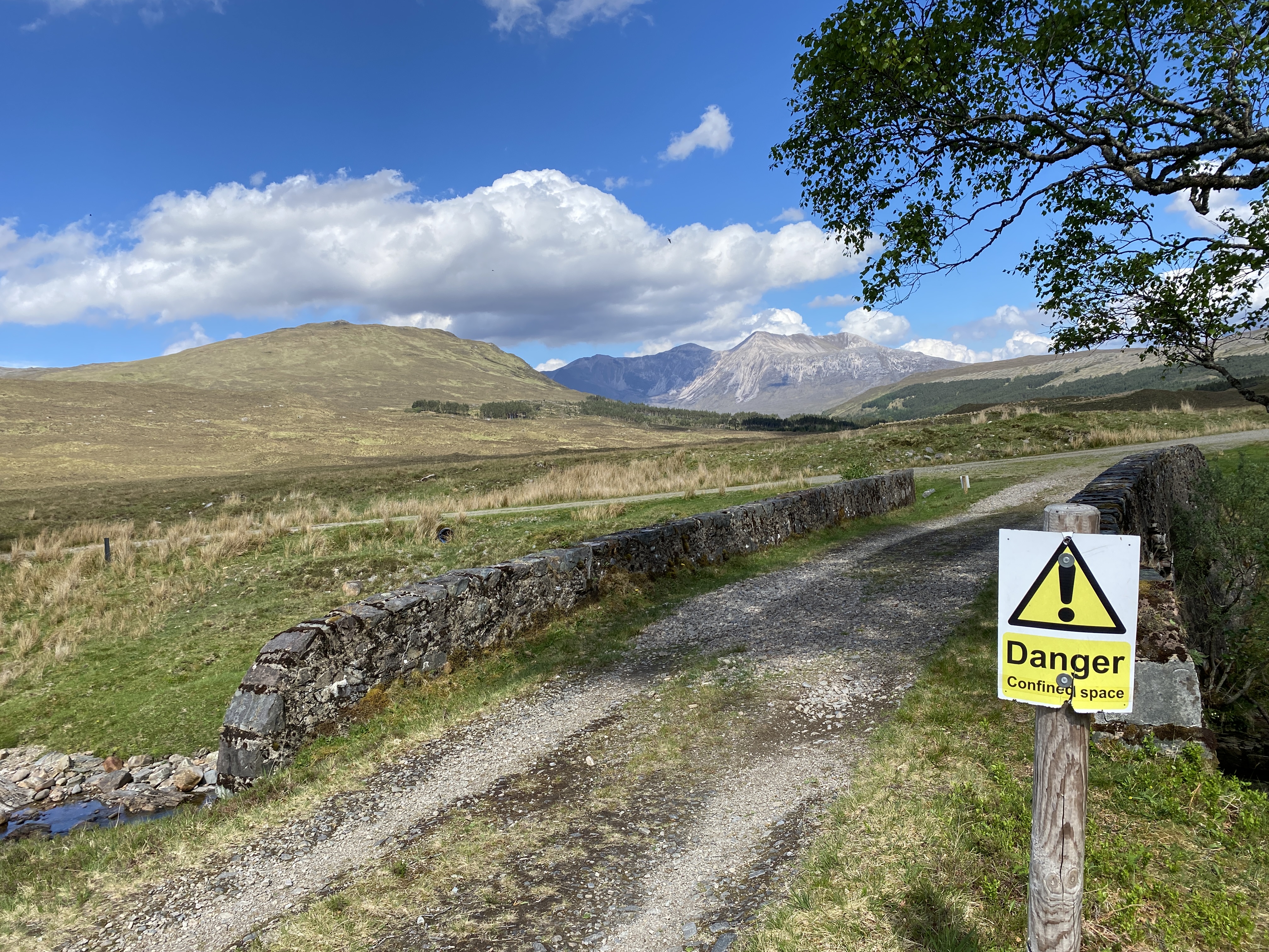 Nachdem ich die Biker-Horde und Easan Dorcha hinter mir gelassen haben, führt der Weg weiter den Coulin Pass hinauf. Dieser Abschnitt ist mit einem breiten Weg gesegnet, doch nun ist kein Hobbyradler weit und breit zu sehen. Dafür die unendlich große Weite des schottischen Hochlands, kaum ein Baum. In der Ferne die Berge von Torridon, nichts als Licht, Luft und Weite. Und ein Schild: Danger. Confined Space. Eine Warnung vor zu wenig Raum in der Mitte der unendlichen Weite? Mein erster Gedanke: Ironie. Doch den nehme ich wieder zurück. Wohl eher Health & Safety. Das allumfassende Sicherheitsdenken im Vereinigten Königreich für alle Lagen des täglichen Lebens. Auch an Orten, wo man zwei Stunden wandern muss, um überhaupt hinzukommen. Egal, dies ist ein Estate und hier wird gearbeitet. Hätten sie mal lieber ein Radfahrer-Warnschild hingestellt als in der endlosen Weite des Hochlands eine Warnung vor zu wenig Platz.