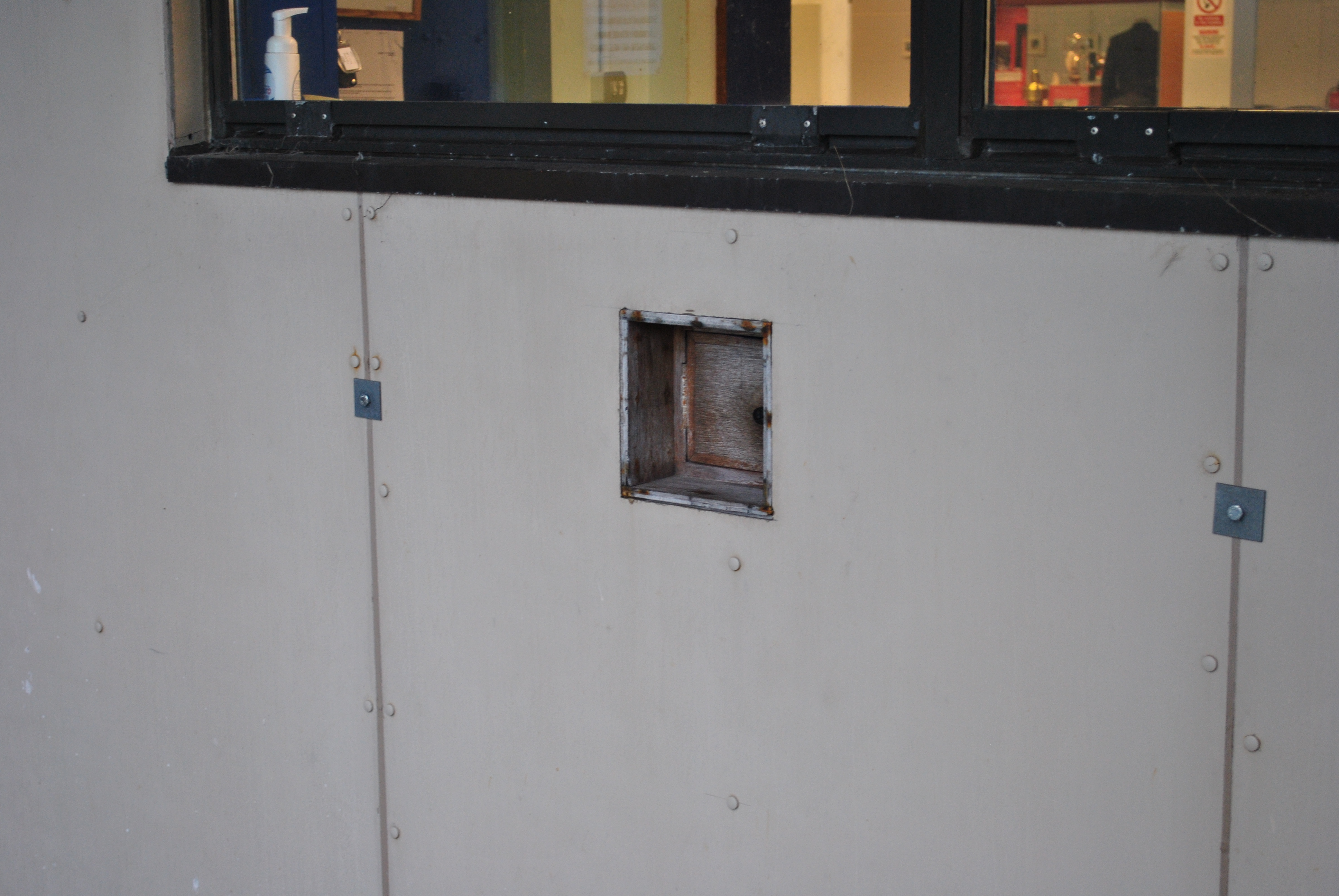 Der Mann geht eine rauchen und kommt wieder. Er hat an der Außenwand des Flughafens eine Klappe hinter dem Mietwagenschalter entdeckt.
