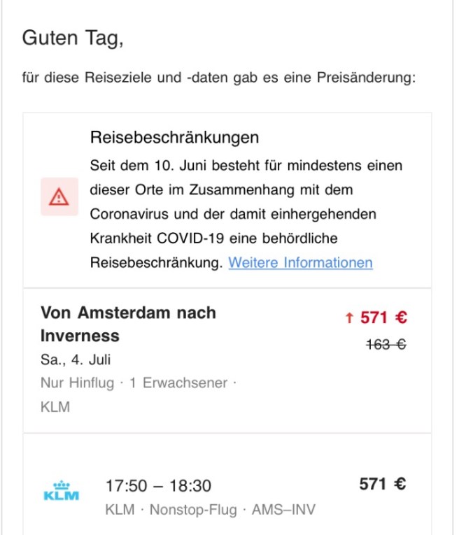 Ich entscheide mich schließlich für KLM und den Flug von Amsterdam nach Inverness, setze einen Google Alert und beschließe noch nicht zu buchen. Er kostet 163,- €, was mir leicht überteuert scheint, aber vielleicht wird er ja noch billiger.